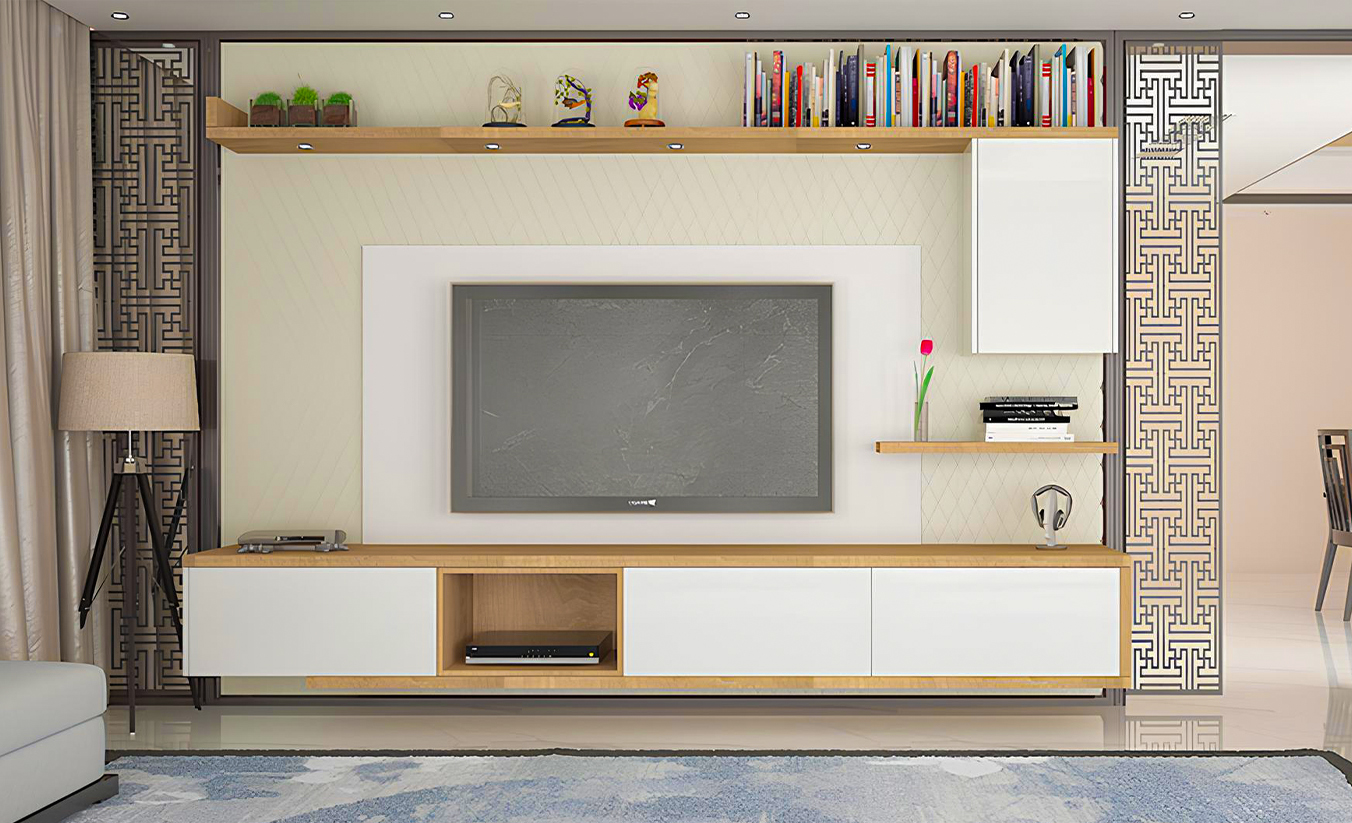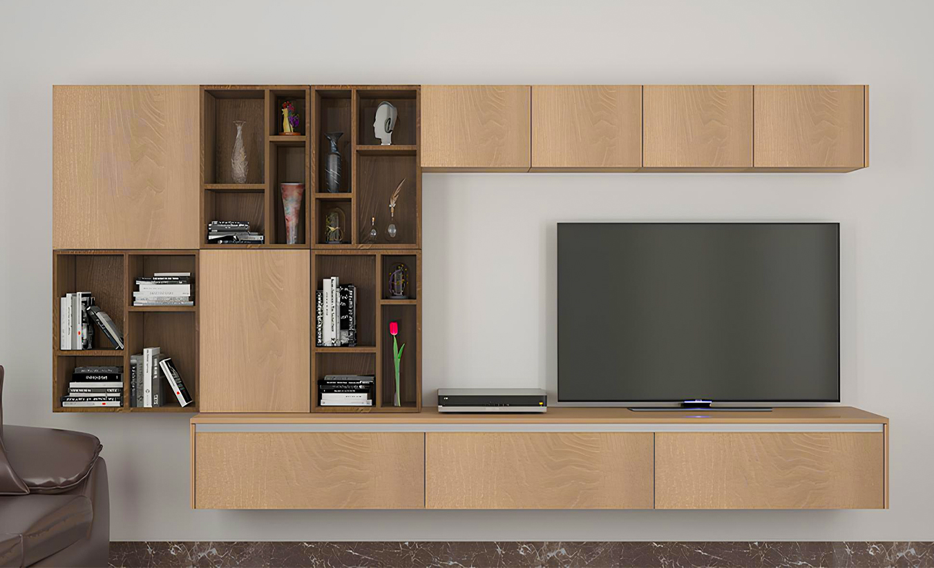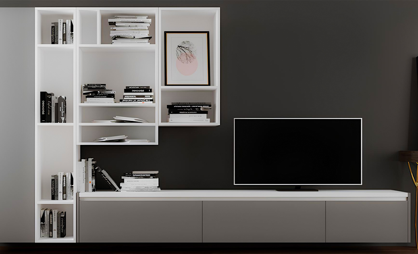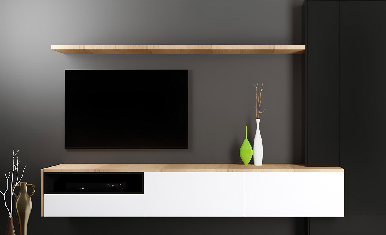 Sleek entertainment units with integrated storage and cable management for a sophisticated, clutter-free appearance.